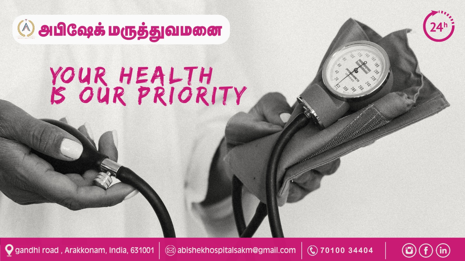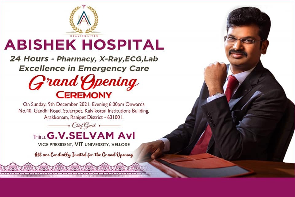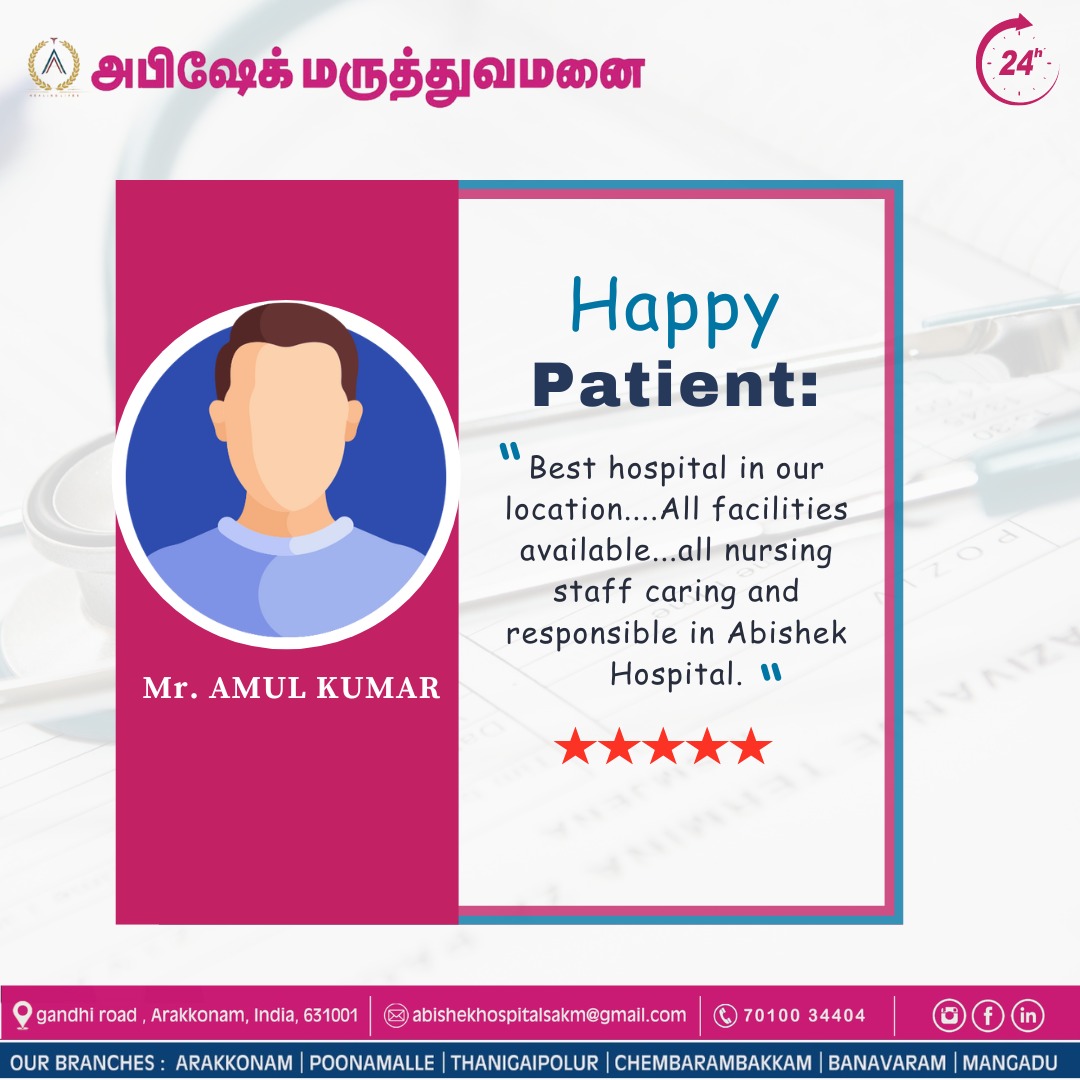 We, at Abishek Hospital 24 Hours provide the highest quality and affordable treatments to our patients. Our hospital is located at Gandhi Road, Arakkonam, Tamil Nadu.